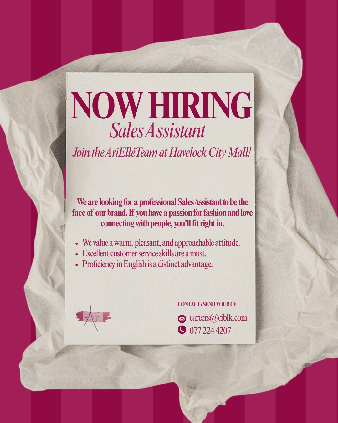 “Join our team! We are looking for enthusiastic and customer-focused individuals to fill Sales and Cashier roles. If you have a passion for delivering great service and enjoy working in a dynamic environment, apply today!”