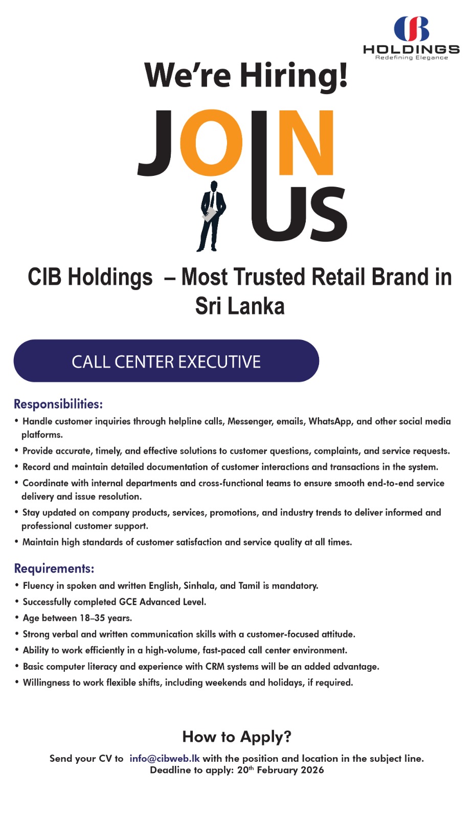 Make sure to include “Call Center Executive” and your location in the subject line when you email info@cibweb.lk.