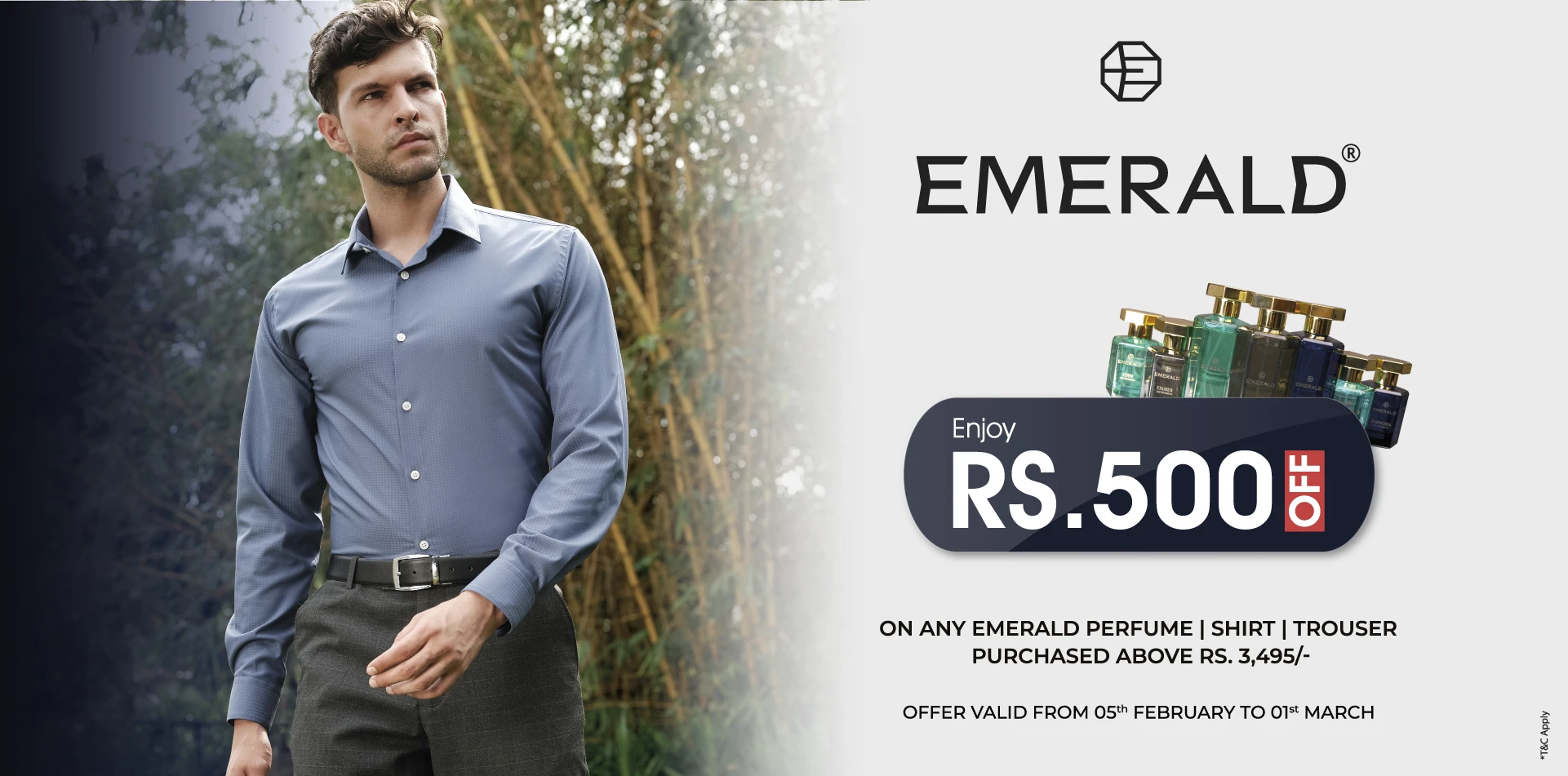 - Receive a flat discount of Rs. 500 OFF on any Emerald Shirt or Trouser above Rs.3495/-.