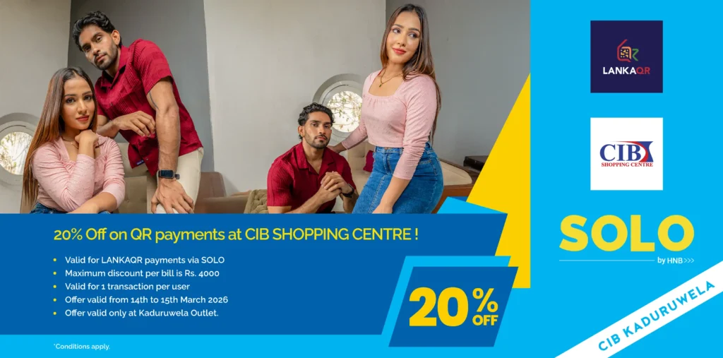 20% Off on QR payments at CIB SHOPPING CENTRE ! Valid for LANKAQR payments via SOLO Maximum discount per bill is Rs. 4000 Valid for 1 transaction per user Offer valid from 14th to 15th March 2026 Offer valid only at Kaduruwela Outlet.