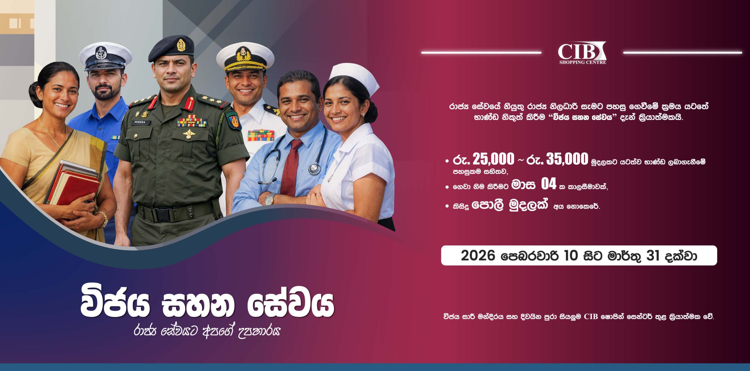මෙම විජය සහන සේවය වැඩසටහන, රාජ්ය නිලධාරී සැමට, පෙබරවාරි 10 වන දා සිට මාර්තු 31 දක්වා සියලුම CIB ප්රදර්ශනාගාර සහ විජය සාරි මන්දිර තුළ ක්රියාත්මක වේ.